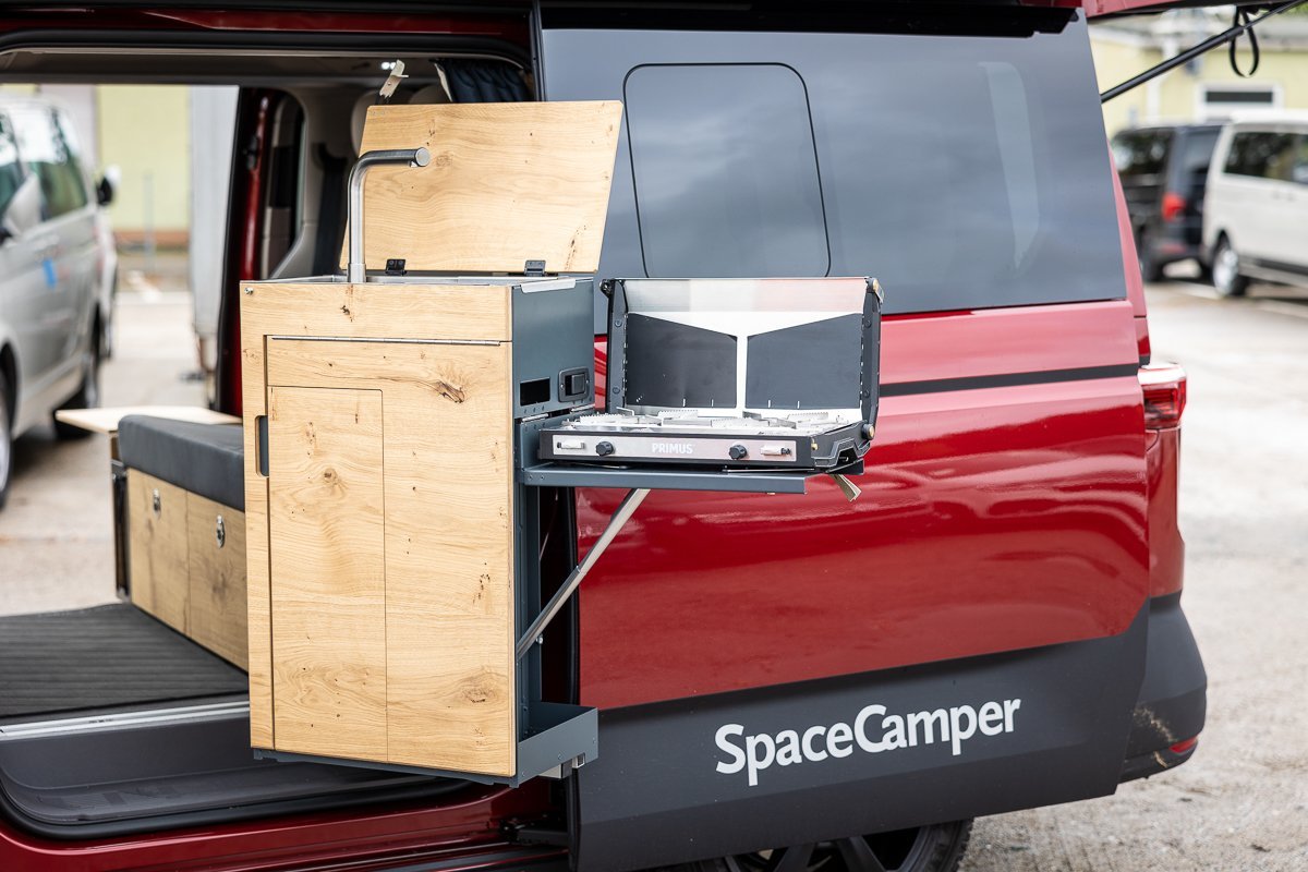 Unser Heckschrank – Das Packwunder von SpaceCamper: In elegantem Holz gekleidet und mit Blenden aus Filz nutzt der Heckschrank jeden Winkel der Karosserie aus und ist einfach von vorne zu beladen. Ausgestattet mit vielen kleinen Zusatz- und Ablagefächern sowie mehreren Stromanschlüssen lässt der Schrank keine Wünsche offen.