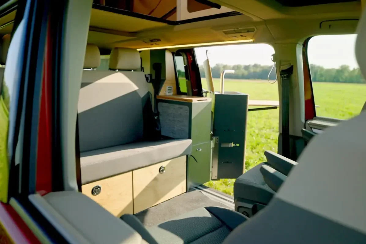 Besonders die Sitzbezüge eines Autos bestimmen, wie der Innenraum eines Fahrzeugs wirkt. Unsere Rückbank hat deshalb serienmäßig immer den gleichen Stoffbezug wie die Original-Vordersitze von Volkswagen. So gibt es keinen unschönen Mix von verschiedenen Mustern. Alle unsere Bezüge – auch von der gesamten Rückbank – lassen sich außerdem ganz leicht über einen Reißverschluss vollständig abziehen und können gewaschen werden. Das finden Sie so bei keinem anderen Campingbus.