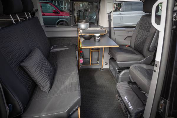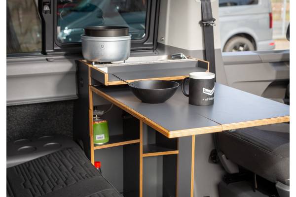 Die unauffällige Konstruktion der Küche bietet neben allen Funktionen einer Reiseküche auch einen stabilen von einer Gasdruckfeder gehaltenen Tisch. Der Tisch ist stufenlos in seiner Neigung arretierbar. Durch die freischwebende Gestaltung ohne Tischbein entsteht viel Beinfreiheit, und der Tisch kann nicht versehentlich umkippen. In der 25-Liter-Kompressorkühlbox neben der Rückbank sind erfrischende Getränke und Snacks stets griffbereit. Der Küchenschrank ist mit einem Spülbecken und einem Kochplatz mit passendem Trangia-Systemkocher ausgestattet. Mit einem Bajonettverschluss kann ein Wärmeleitkragen auf dem Kocher fixiert werden, in dem das Kochgeschirr sicher und wärmeeffizient gehalten wird. SpaceCamper-typisch kann die Kocheinheit für den Einsatz im Freien leicht aus dem Fahrzeug genommen werden.