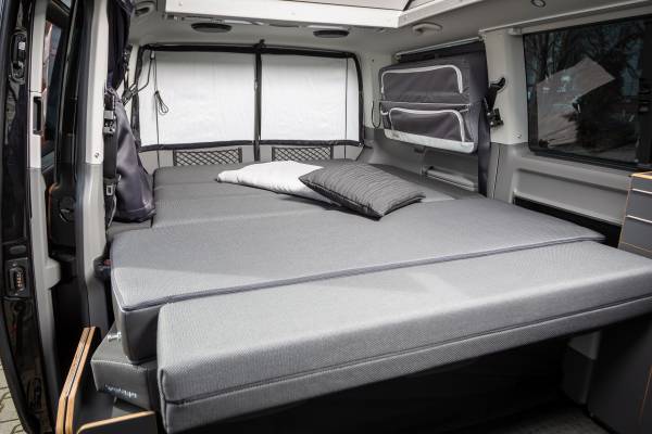 Der SpaceCamper Light verbindet den großen Kofferraum eines Transporters mit dem Komfort einer Großraumlimousine – und muss sich auch auf dem Campingplatz nicht verstecken. Ausgestattet mit Bett, Küche und Kühlbox steht dem nächsten Urlaub nichts im Wege. Die SpaceCamper-Rücksitzbank für drei Personen geht beim Light über die gesamte Fahrzeugbreite. So entsteht durch Umklappen der Rückenlehne ein bequemes und besonders breites Bett. Unsere patentierte Konstruktion ist nicht nur die leichteste Rückbank auf dem Markt, Bettumbau und Bettausbau gelingen mit ihr am schnellsten. Die Bank ist voll durchladefähig, um für Sportgeräte oder andere Gegenstände den nötigen Platz zu schaffen. Außerdem kann eine Person die Bank allein und ohne Werkzeug in kürzester Zeit ausbauen. Rückbank, Heckpolster und eine platzsparend schlanke Küche hinter dem Fahrersitz bilden die Basis des SpaceCamper Light.